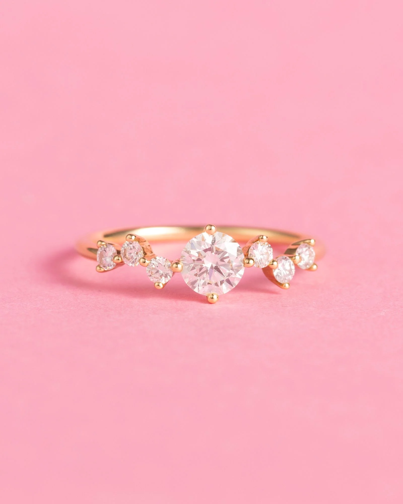 - Bague Colette en or rose recyclé 18 cts, sertie de 7 diamants recyclés de taille brillant, de qualité G/H, pureté Vs/Si, pour un total de 0,65 ct.