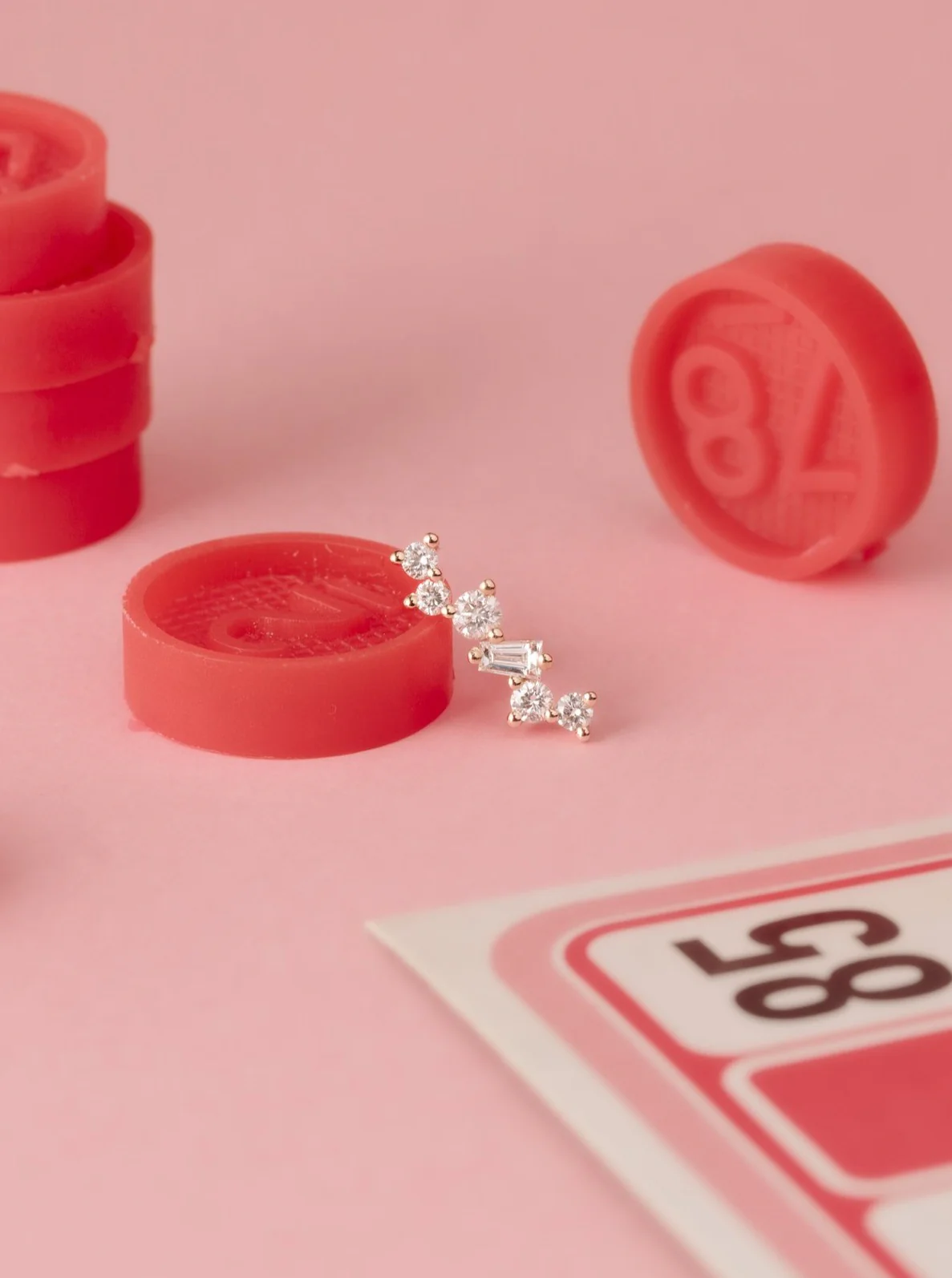 - Boucle d'oreille Céleste vendue à l'unité en or rose recyclé 18 cts, sertie de 5 diamants recyclés de taille brillant pour un total de 0,20 ct et d'un diamant trapèze de 0,06 ct.